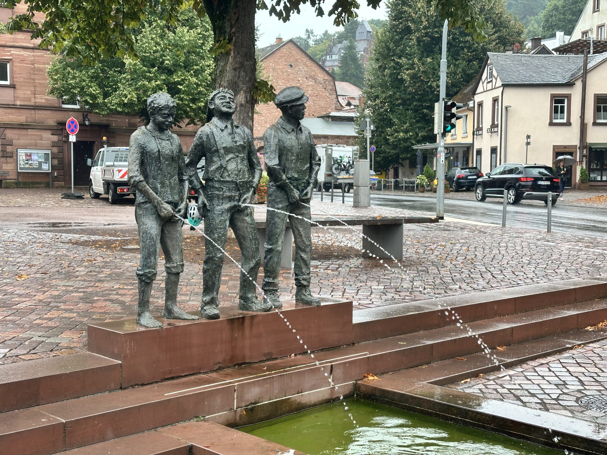 De route werd steeds leuker. We verlieten de Main bij Miltenberg, wat een leuk stadje moet zijn als het niet regent en er geen kermis in de weg staat, om richting het Erftal af te buigen. Dat is geen slechte keus van de routebouwer, want het werd steeds mooier en leuker om doorheen te fietsen. Het was ineens veel rustiger dan daarvoor en we reden over kleine landwegen en fietspaden langs de – snelstromende – Erf.